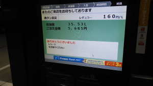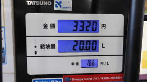17:16 | 27℃ | 〇 | 265,560 | 367.6 | 20.00 | 17:16 宇佐美41号下呂SS ODO 265,560q TRIP 367.6q 27℃ 48.5q 計 322.6q 20.00L @166.- \3,320.- (累計 ※371.1q、20.48L、3、397.- (3.5q、0.48L、77.-)) |